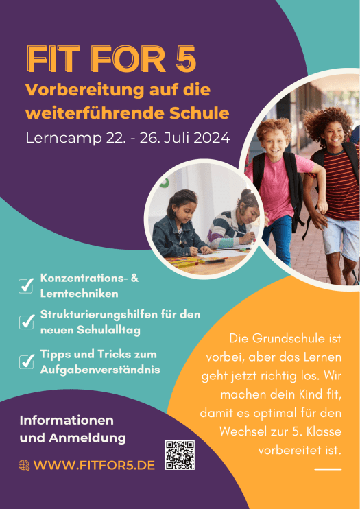 FIT FOR 5 findet als Lerncamp in den Sommerferien vom 22.7.24 bis 26.7.24 in der Zeit von 9-13 Uhr statt.